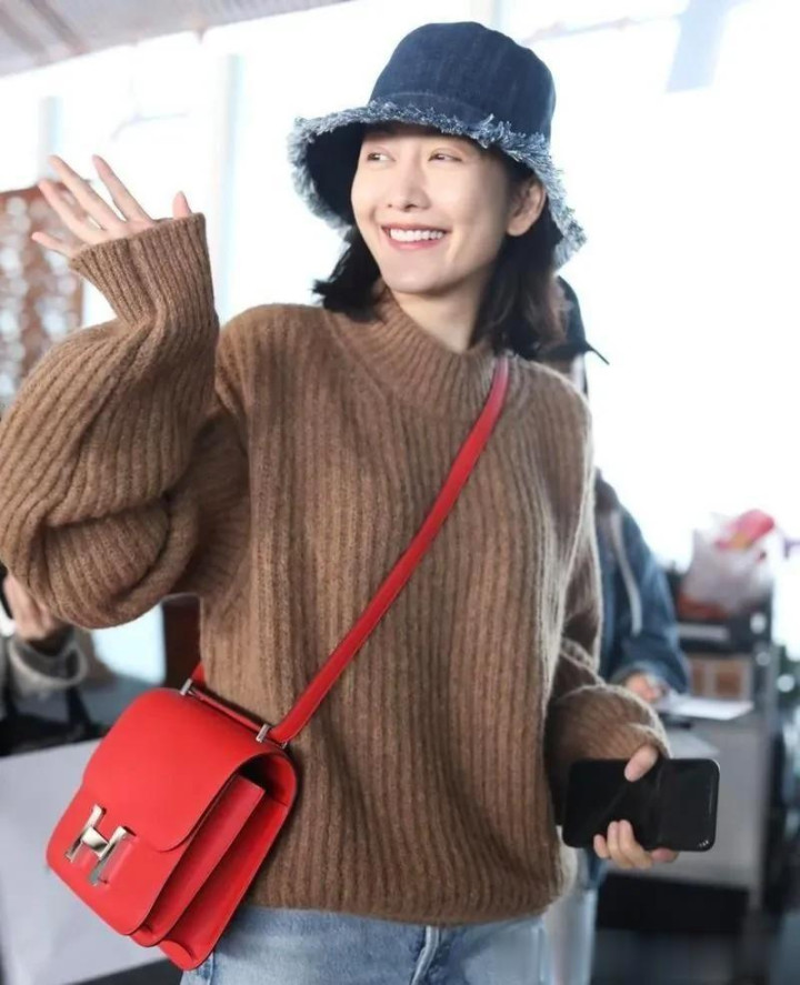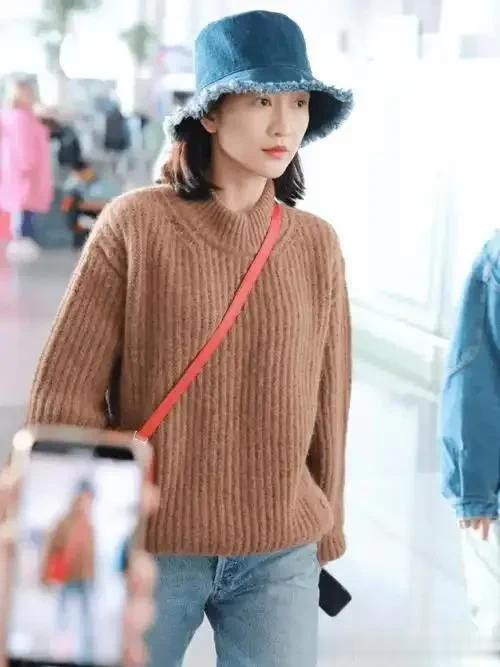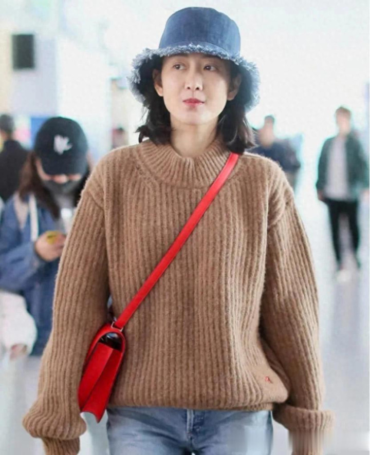 王鸥机场私服真时髦! 美拉德毛衣配牛仔直筒裤, 洋气又减龄!